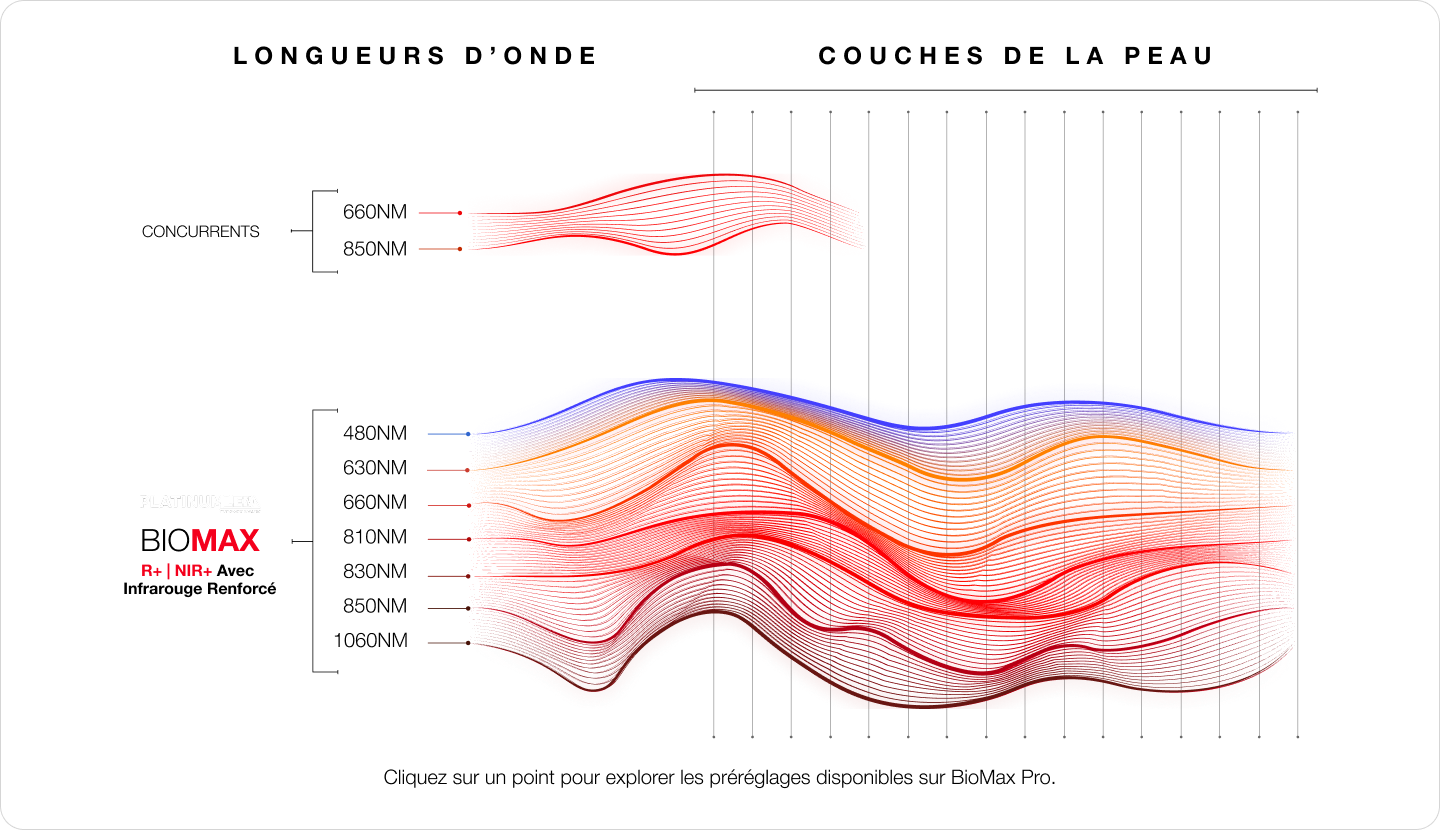 Notre spectre multi-ondes R+|NIR+ exclusif, en instance de brevet, offre la thérapie par lumière rouge la plus avancée qui soit : il exploite sept longueurs d'onde différentes de lumière rouge et infrarouge pour une thérapie véritablement innovante dans toutes les applications.